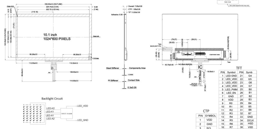 यसको केवल 235mm × 143mm × 7.05mm को स्लिम आयामहरूले यसलाई कम्प्याक्ट उपकरणहरूको लागि उपयुक्त बनाउँछ। 3.3V द्वारा संचालित र 40-पिन FFC केबल (CTP को लागि 6-पिन FFC) प्रयोग गरी, 10.1 इन्च औद्योगिक PCAP टच स्क्रिन मोड्युल -20°C देखि 70°C सम्मको तापक्रममा सञ्चालन हुन्छ र -30°C देखि 80°C सम्मको भण्डारण तापमान दायरा हुन्छ, कठोर वातावरणमा पनि भरपर्दो सञ्चालन सुनिश्चित गर्दै।